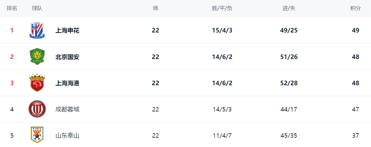 这场比赛让争冠格局更乱了!上海申花依然占据榜首,15胜4平3负的战绩拿到49分。不过,上海申花的领先优势很少。北京国安赢球之后,总积分达到48分,升到第2名,只落后上海申花1分。上海海港的积分和北京国安一样,也是48分。排名第4的成都蓉城则是47分。前4的球队差距最多也就只有2分,冠军的争夺真的是太激烈了。